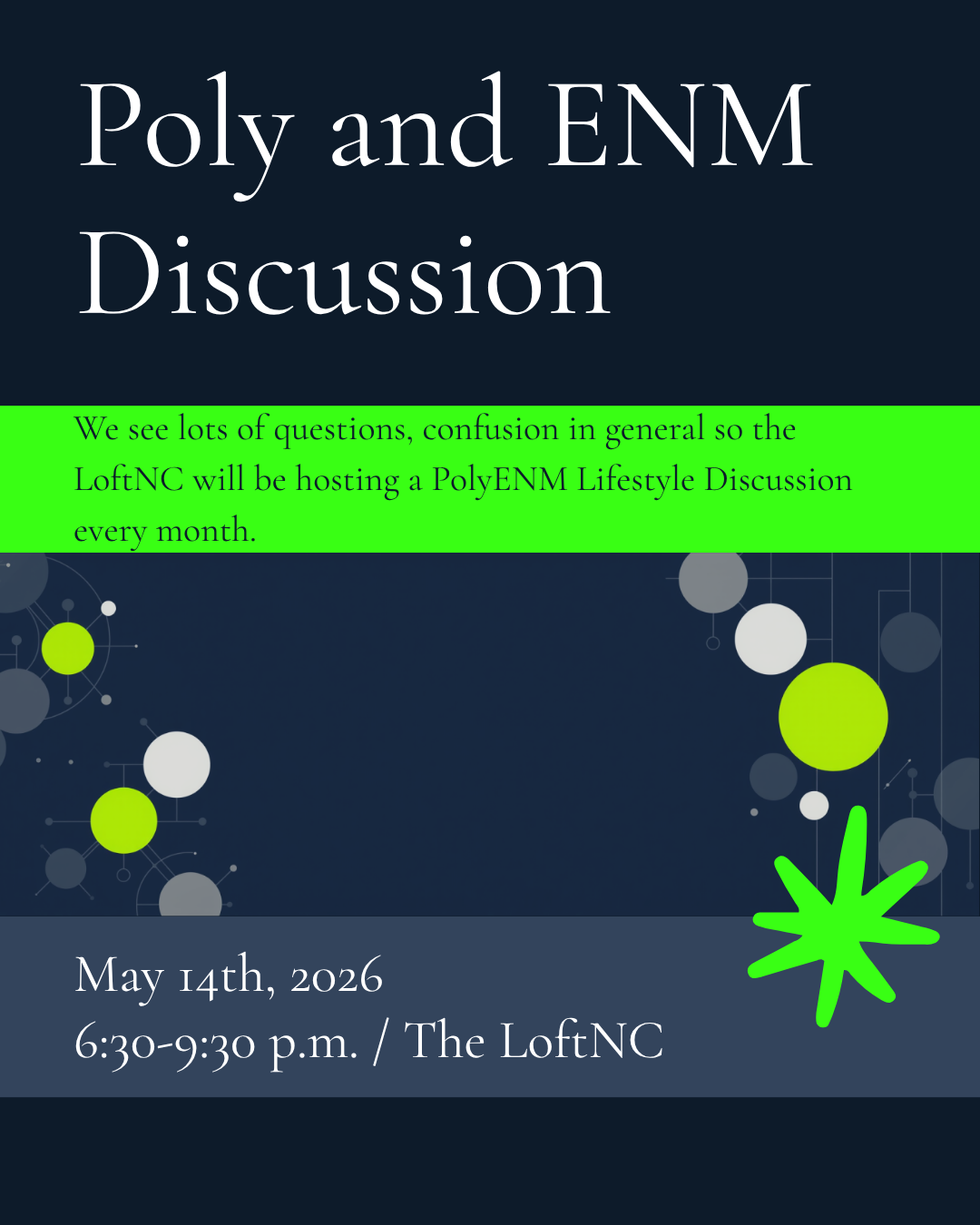 We see lots of questions, confusion and general how do we do poly lifestyle so the LoftNC will be hosting Poly Lifestyle Discussion every 2nd Thursday of the month.