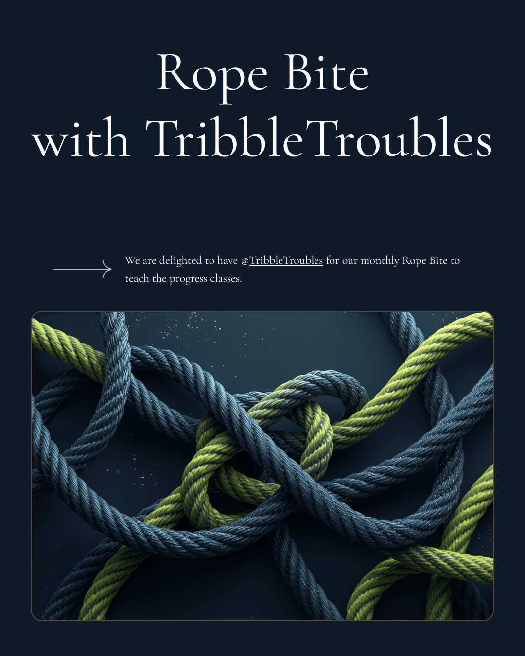 We are delighted to have @TribbleTroubles for our monthly Rope Bite to teach the progress classes. As the class progresses into more detailed rope, @LilTribble will be available to teach the beginning class to newcomers.