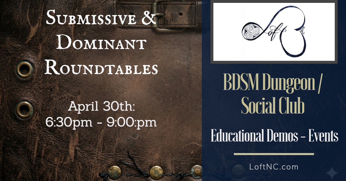 Come join the LoftNC submissive & dominant round tables meeting every last Thursday of the month for discussion topics for both sides of the slash.