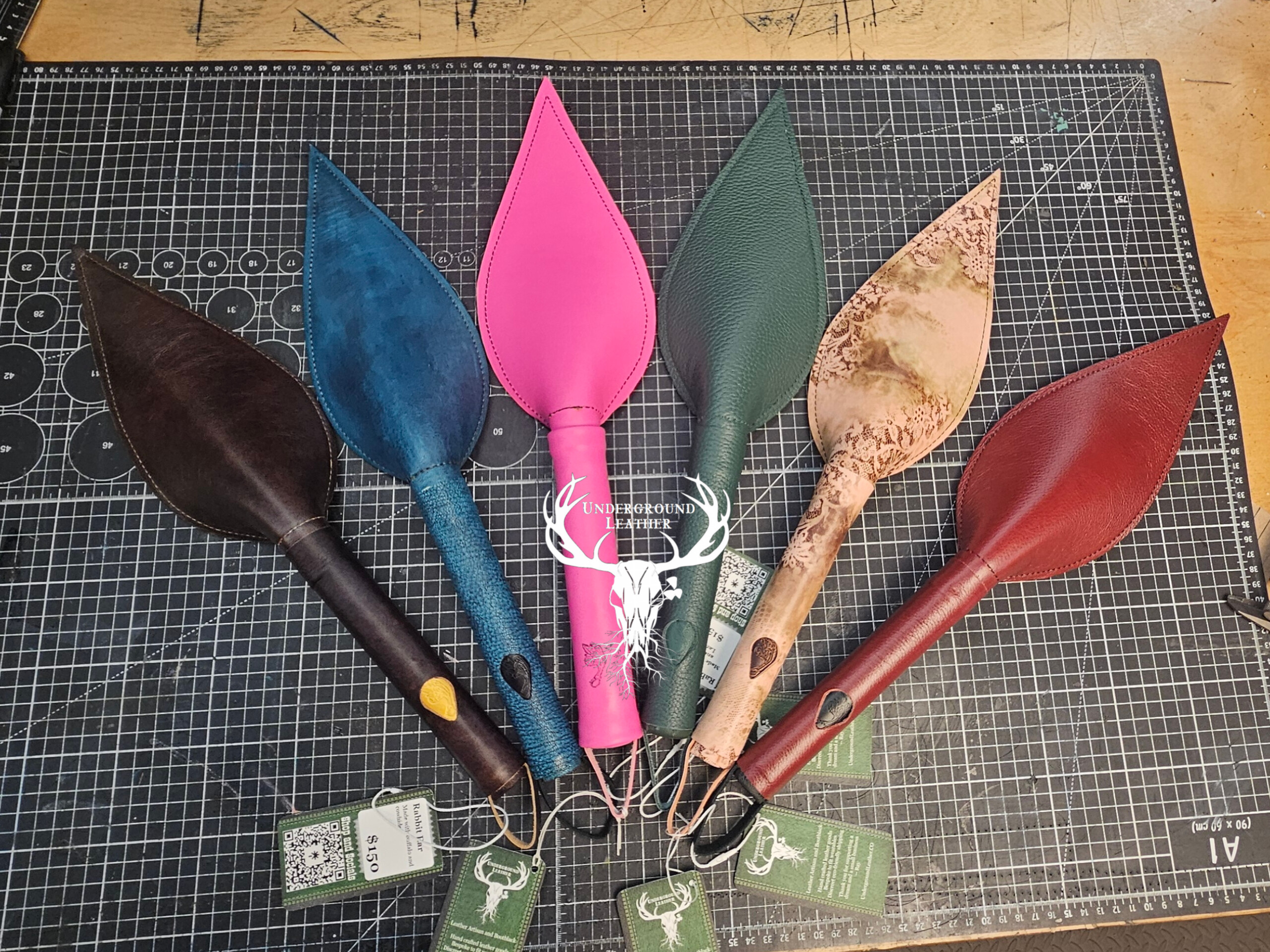 Last but not least: they feature a rotating selection of one-of-a-kind floggers. Every flogger is uniquely crafted with carefully curated hides and to give it some pizzazz. All handles and weighted and hand stitched.