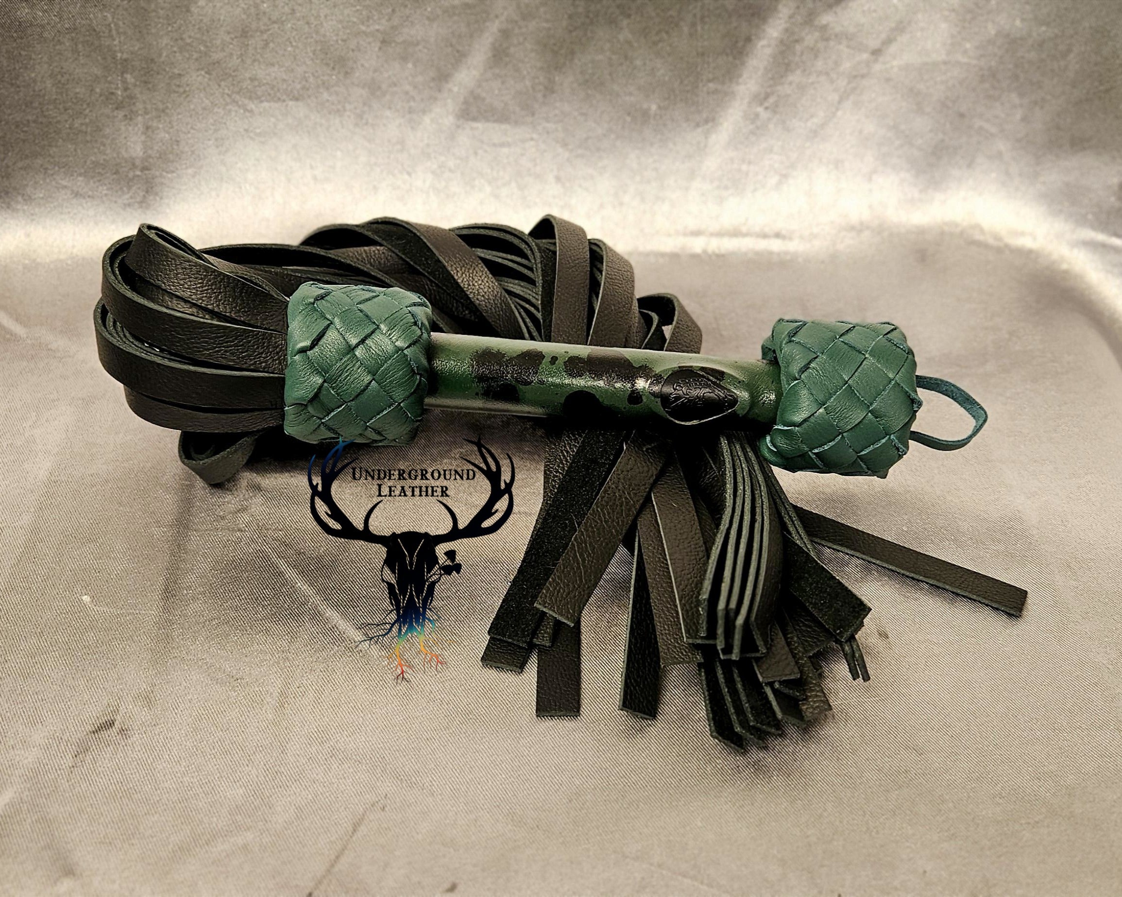 Green leather flogger with a dark green handle featuring hand-carved ginko leaf patterns and brown braided leather knots.